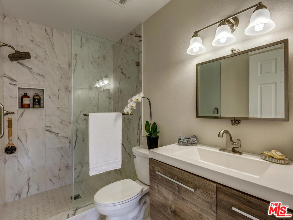 Everything you have been waiting for!! Renovated top floor condo in the best location of the popular Tara Hills Complex. Walk into a bright living room with beamed vaulted ceilings and French Doors leading to a large balcony overlooking trees, flower garden, front of complex, and Clubhouse area. Lovely wood flooring throughout!! Updated kitchen with pantry, new white shaker cabinets, stainless steel DW and double sinks, Blanco Venatino quartz counters and ice bevel subway glass tile back splash. Master suite has dbl closets with mirrored doors and a wonderful newly remodeled bath with an over sized custom frame less walk-in shower, glass enclosure, Matte ceramic shower walls and flooring with white stone look. Floating vanity sink with cultured marble counter. Bright spacious 2nd bedroom as well. Stunning new full bath in hall with Matte white octagon ceramic mosaic shower walls, white stone look flooring, and more. Simply perfect throughout and ready for your move!!!!