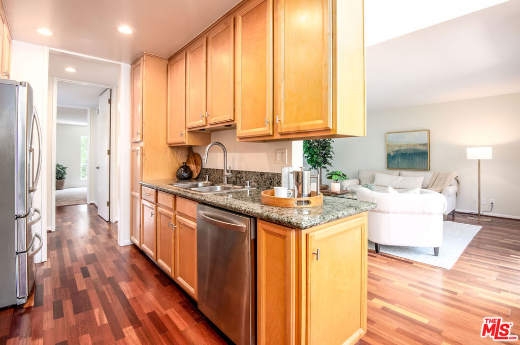 Rarely offered is this top floor end unit floorplan featuring a private entrance and volume ceilings with clerestory windows that span across the living and dining rooms. Upon entry delight in the open and modern space showcasing imported cherrywood floors, light-filled dining room with large windows, and wonderful outdoor balcony off the living room. The kitchen is sure to impress with its granite countertops, stainless steel appliances, and abundant custom-designed cabinets that extend into the dining area. All 3 bedrooms are spacious and comfortable with the en-suite featuring dual closets and wonderful tiled bath. The other 2 bedrooms share a bathroom off the hallway. Other highlights include interior courtyard views, smooth ceilings, new bedroom carpeting and spa-inspired paint throughout, and attic storage space. Additional storage in the designated parking space below the unit. Enjoy resort-style complex amenities and easy access to nearby shopping, eateries, and parks.