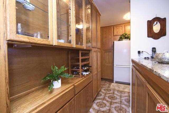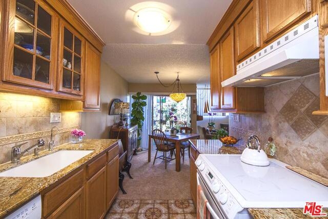 Highly sought-after top floor corner end unit with impressive views of the lush interior grounds from every room. Premier location near the complex's resort-style amenities including the inviting outdoor pool, gym, clubhouse, & peaceful babbling brook below. Enter into an open & bright living room with a wall of windows that frame the outside trees. Enjoy a superb custom kitchen featuring rich wood cabinets with pullouts, granite counters, full tiled backsplash, deep oversized sink, slide-in oven, & decorative tile flooring. The private master suite boasts a double-sided walk-in closet with custom shelving & abundant pull-out storage drawers. The 2nd bedroom is good size with full-length closets. Additional features of this exceptionally-maintained home include a bar area with granite counters & custom cabinetry, ceiling fans throughout, private patio, & convenient location near the elevator & laundry room. Vibrant Downtown Culver City, shopping malls, eateries, & parks are all nearby.