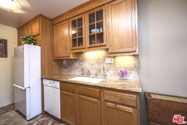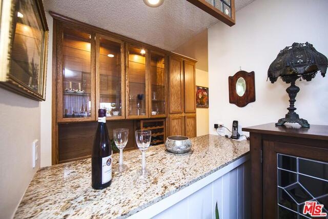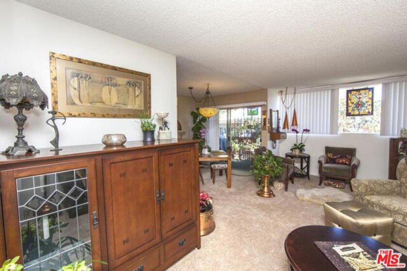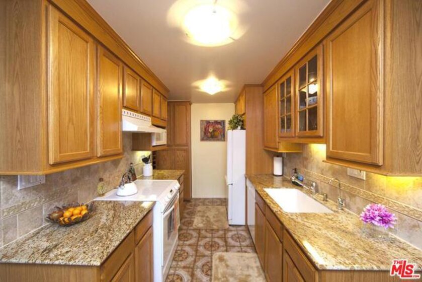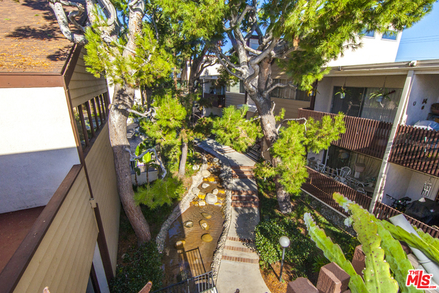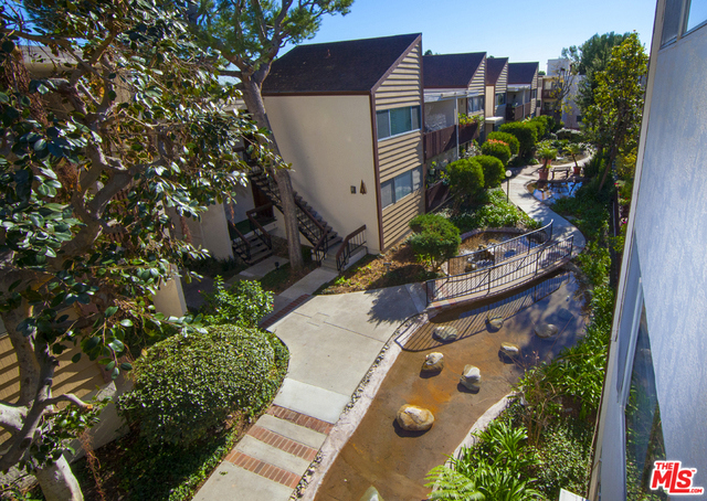 Highly sought-after top floor corner end unit with impressive views of the lush interior grounds from every room. Premier location near the complex's resort-style amenities including the inviting outdoor pool, gym, clubhouse, & peaceful babbling brook below. Enter into an open & bright living room with a wall of windows that frame the outside trees. Enjoy a superb custom kitchen featuring rich wood cabinets with pullouts, granite counters, full tiled backsplash, deep oversized sink, slide-in oven, & decorative tile flooring. The private master suite boasts a double-sided walk-in closet with custom shelving & abundant pull-out storage drawers. The 2nd bedroom is good size with full-length closets. Additional features of this exceptionally-maintained home include a bar area with granite counters & custom cabinetry, ceiling fans throughout, private patio, & convenient location near the elevator & laundry room. Vibrant Downtown Culver City, shopping malls, eateries, & parks are all nearby.