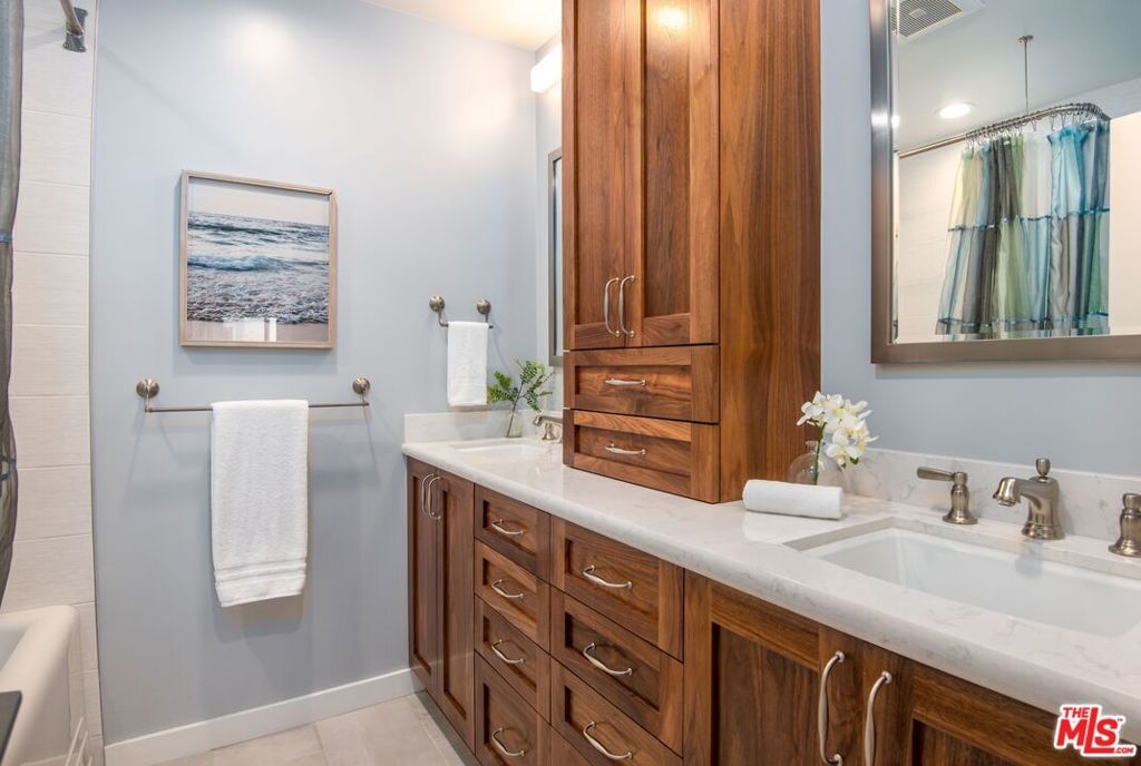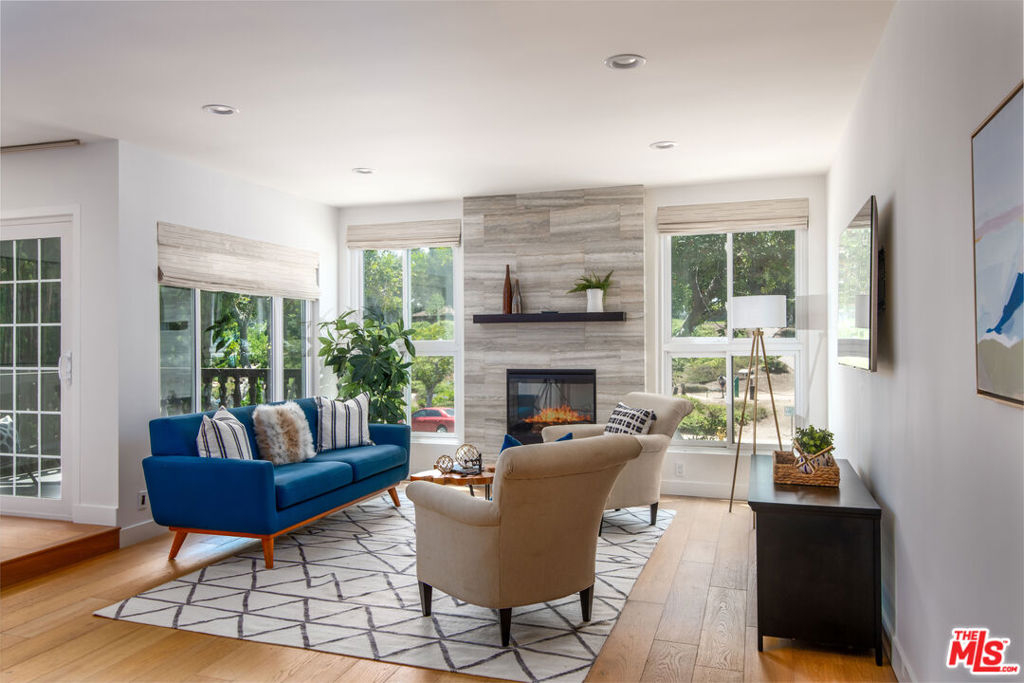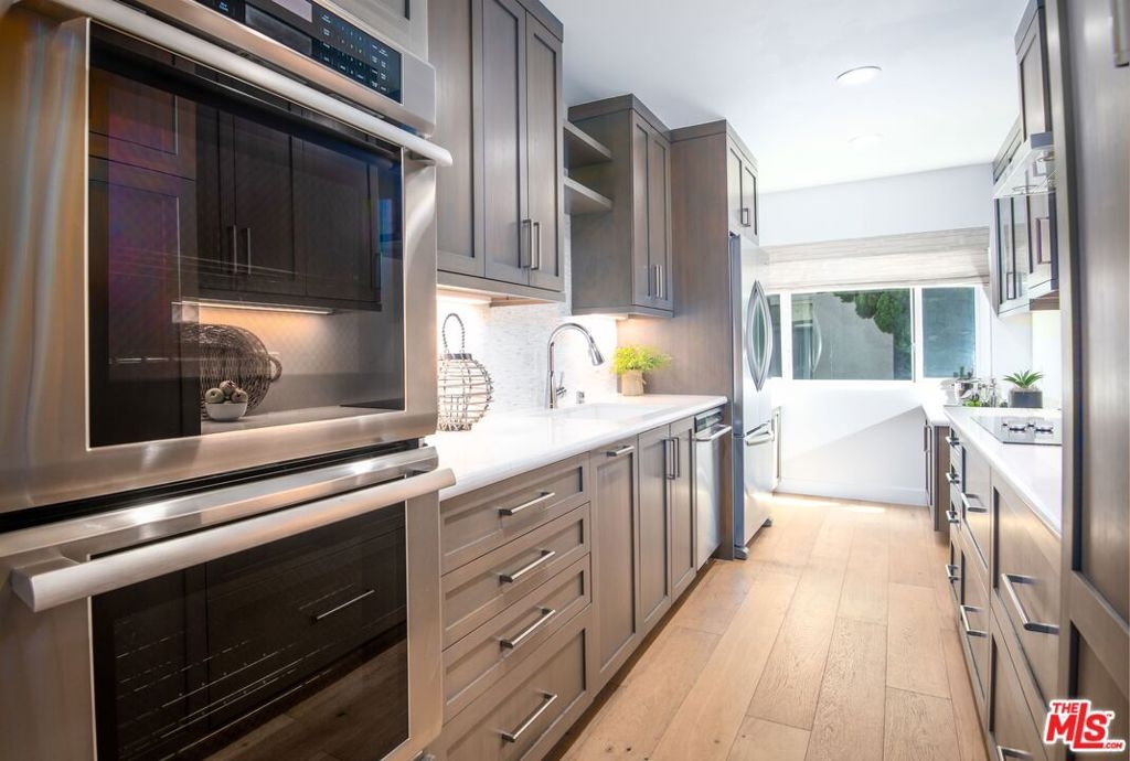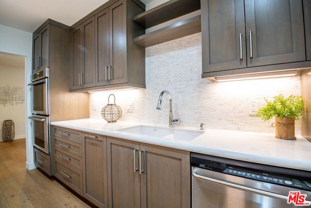 Enjoy upscale living in this exquisitely remodeled corner end unit with incredible flow and pleasant views of the park located across the street. Step into the formal entry and admire the open and airy sunken living room with contemporary farmhouse-style heated floors, decorous fireplace, and elegant clean lines. The gourmet kitchen is sure to impress with custom pecan-stained cabinets, Cambria quartz countertops and backsplash, and high-end stainless appliances including Thermador dual convection ovens. The adjoining dining area opens to the living room and balcony...perfect for entertaining guests. The bedrooms are roomy and comfortable with the primary suite boasting a walk-in closet and both bathrooms have been fully-customized with walnut vanities, quartz countertops, and on-trend fixtures and lighting. Additional highlights include recessed lighting, dual pane windows with custom treatments, upgraded electrical panel, WiFi-enabled thermostats, and SxS parking near the elevator.