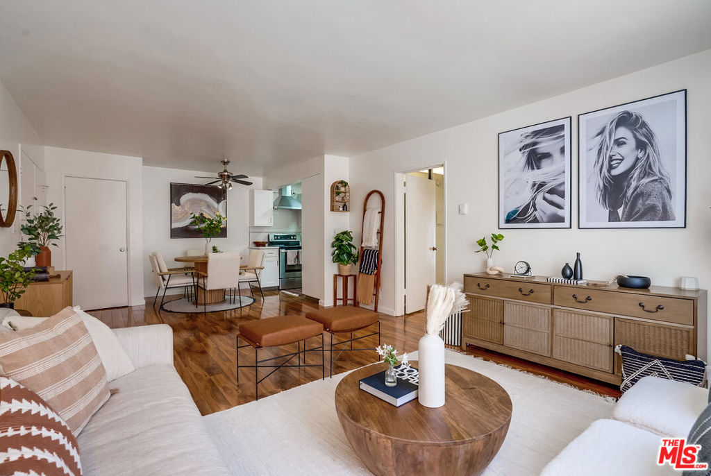 The Villa Andorra complex offers this ground floor unit with pool views. The renovated kitchen boasts shaker cabinets with a pantry space, stainless steel appliances, quartz countertops and newer fixtures/sink. The bathrooms have decorative paisley style accents and updated vanities, sinks and fixtures. The primary bedroom offers an ensuite bath. Both bedrooms are elevated above the street for added privacy. The tiger striped laminate floor run throughout the bedrooms and living spaces. This Spanish style complex features dramatic curved arches and a recently updated entryway/lobby. Parking is side by side. Located within Fox Hills, just steps from the park which offers basketball courts, tennis courts, picnic benches, and a grassy area. A short distance from the 90 Freeway & the 405.