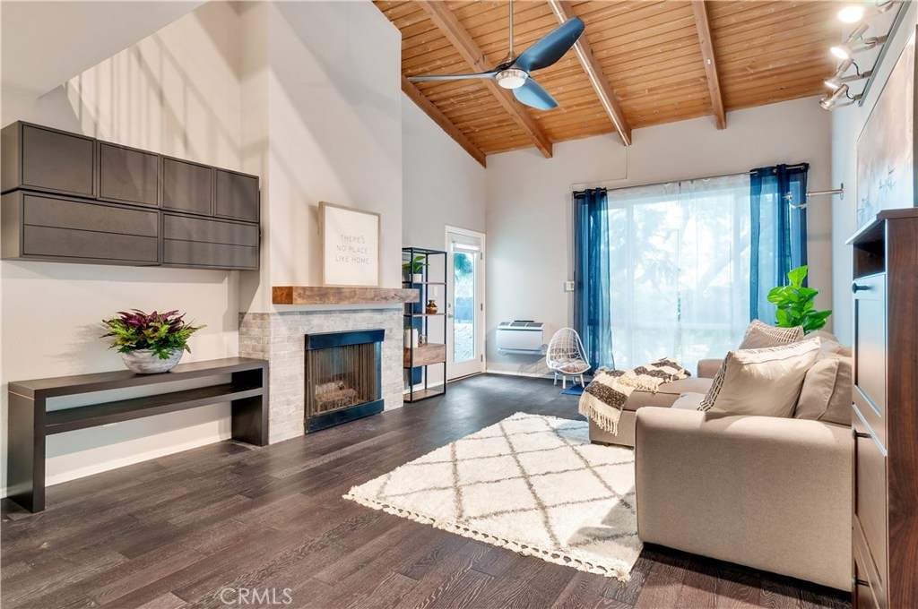 Welcome to Windsor Fountains Condominiums. This beautifully remodeled end unit, upper level condo is ready for a new owner. As you walk in, you will immediately be drawn to the vaulted wood beamed ceilings or the floor to ceiling gas fireplace. Enjoy a new kitchen with quartz countertops, newer stainless steel appliances (refrigerator, dishwasher, stove, microwave, stackable washer/dryer all included in the sale) and new engineered hardwood flooring throughout. This community offers resort style living with a variety of amenities including pool, tennis courts, dry sauna, hot tub, rec room, gazebo picnic area and lush landscaped grounds. There are two tandem parking spaces. Parking spot includes an EV Chargepoint Level 2 charger (approved by the HOA). Curious? Call me for a private tour.