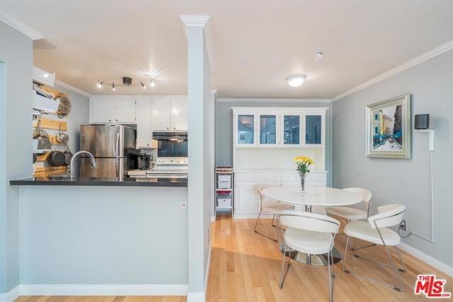 Don't miss this gorgeous top floor corner unit condo in one of the most highly sought-after resort-style complexes in the Heart of Culver City. Bursting with brightness by a host of skylights, this updated 1 bedroom+1 bath contemporary unit features an open floor plan punctuated by a dramatic living room with vaulted wood-beamed ceilings, floor-to-ceiling gas fireplace, and private patio overlooking the lush grounds. The culinary kitchen offers a deep stainless steel sink, refrigerator, and dishwasher, while the generous master bedroom enjoys a large walk-in closet. Admire the rich interior details including gleaming wood floors, a designer color palette and intricate crown moldings throughout, or escape to the community clubhouse, pool, spa, sauna, tennis courts or BBQ station for exterior relaxation. 2 car tandem parking and low HOA dues complete the picture. Style and location combined!