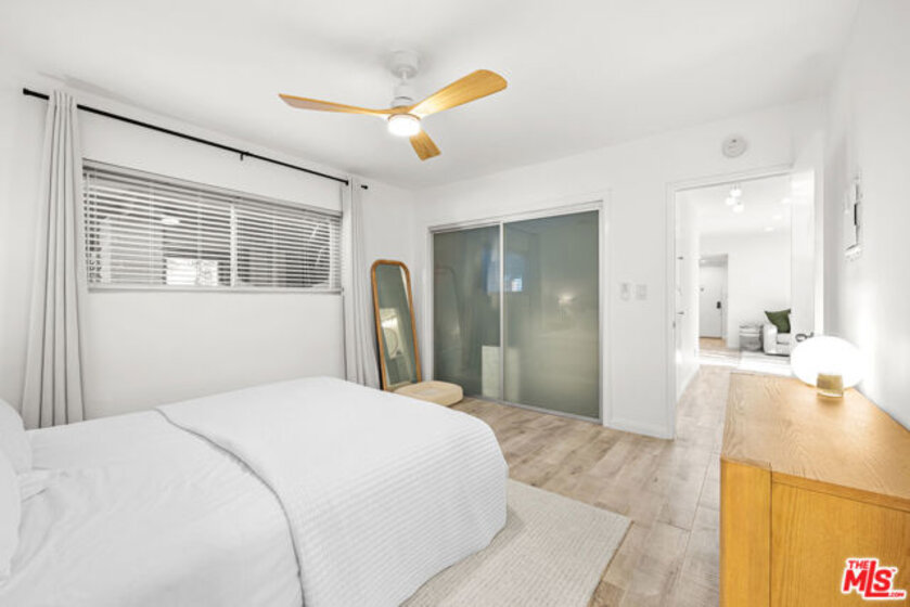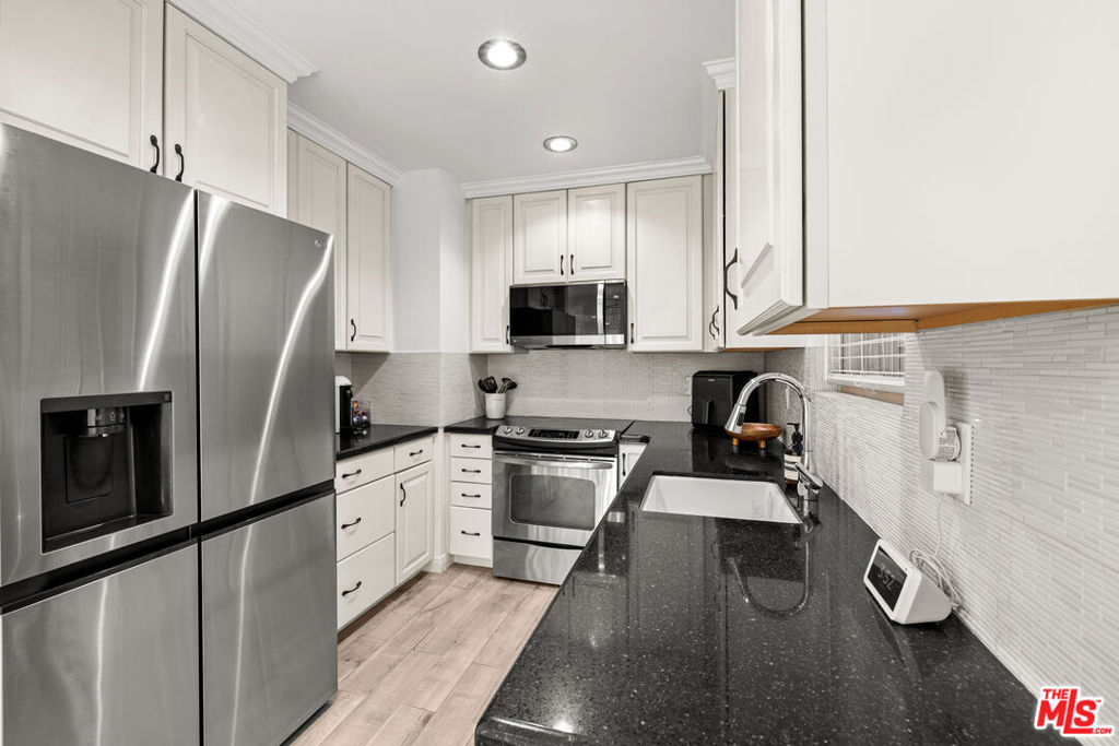 Welcome to this bright & airy first floor condo at the Windsor Castle - elevated high above the street for added security. This corner unit (only 1 common wall) showcases wood tile floors & moldings throughout, smooth ceilings, recessed lighting & ceiling fans. The fantastic oversized patio w/Saltillo floors surrounded w/trees & plants is a Zen like retreat! Beautifully renovated kitchen offers new shaker cabinets, stainless steel appliances, stone counter tops & chic boutique style tiled backsplash. Renovated baths include new vanities, sinks, subway tiles & fixtures. Quaint complex offers controlled access w/pool, elevator, 2 side by side parking spaces (38/39) & storage units in front of the parking spaces. Low HOA fees covers gas, trash, water & common wall.