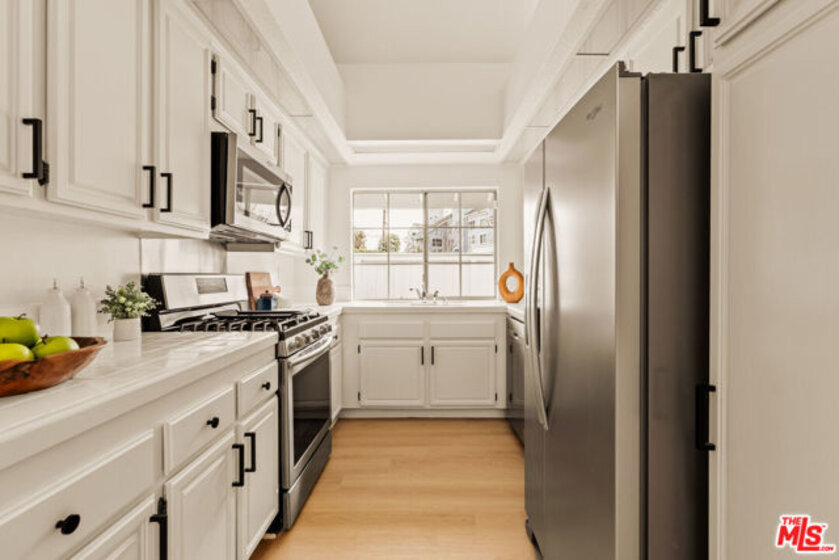 Set within the highly sought-after Foxgate community, this rarely offered end-unit townhome offers an exceptional blend of privacy, light, and lifestyle convenience. With only one shared wall and direct access to a two-car garage, the residence lives like a private home while benefiting from the ease and charm of a well-established neighborhood. Inside, brand new vinyl plank flooring creates a cohesive, modern foundation and leads you into a dramatic living space defined by soaring two-story ceilings. The living room, dining area, and kitchen flow together seamlessly, creating an open, inviting environment ideal for both everyday living and entertaining. Skylights above the dining area flood the space with natural light, enhancing the home's bright and airy ambiance. Glass sliders extend the living area to a private, enclosed patio, offering a quiet outdoor escape for relaxing or hosting. The main level is thoughtfully appointed with a powder bath, a full-size utility room, and effortless access to the garage. The kitchen is designed for both function and style, featuring updated stainless steel appliances that support everything from casual meals to gatherings with friends. Upstairs, two generously sized bedroom suites provide true retreats, each with its own ensuite bathroom and walk-in closet. The layout offers comfort and separation, allowing each space to feel personal and serene. Beyond the home itself, the location is equally compelling. Just moments away, Fox Hills Park offers tennis courts, open fields, a playground, and a scenic walking path, creating a natural extension of your living space and a perfect setting for recreation and relaxation. Commuting and exploring Los Angeles is effortless, with quick access to the 90 Freeway connecting you to major area freeways and thoroughfares. Nearby, La Cienega and La Brea Boulevards provide convenient routes to the Eastside and the South Bay, placing the best of the city within easy reach. Beautifully renovated and move-in ready, this Foxgate townhome presents a rare opportunity to enjoy refined, low-maintenance living in a location that truly connects you to it all.