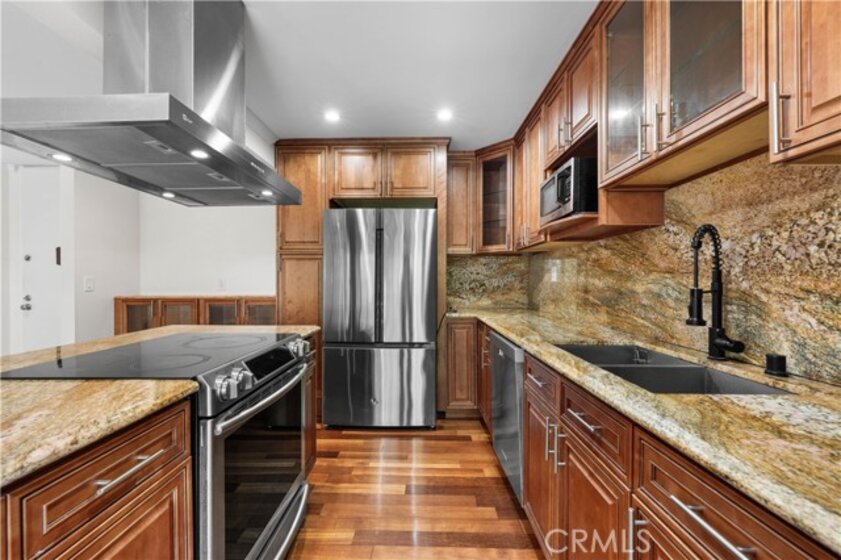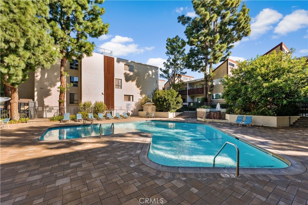Experience elevated Westside living in this beautifully remodeled top-floor 2-bedroom, 2-bath residence with peaceful greenbelt and treetop views. A bright, open layout filled with natural light showcases cherry hardwood floors, crown molding, and recessed lighting throughout. The updated island kitchen features stainless steel appliances, café-toned shaker cabinetry, granite countertops, and backsplash, flowing seamlessly into the living and dining areas with a built-in wine cabinet. Both bathrooms are tastefully upgraded with granite counters, subway tile, and frameless glass shower doors. The spacious primary suite offers a walk-in closet, jetted tub, and built-in full-length mirror. Additional highlights include a nearby laundry room and two side-by-side parking spaces next to the elevator. Located in prime Culver City near Silicon Beach, Playa Vista, Downtown Culver City, LAX, the Expo Line, and top shopping and dining, with Fox Hills Park just a short walk away. The pet-friendly Pines community offers resort-style amenities, including a heated pool, fitness center, saunas, clubhouse, and Amazon lockers. HOA dues include water, trash, and insurance, and residents qualify for Culver City Unified School District.