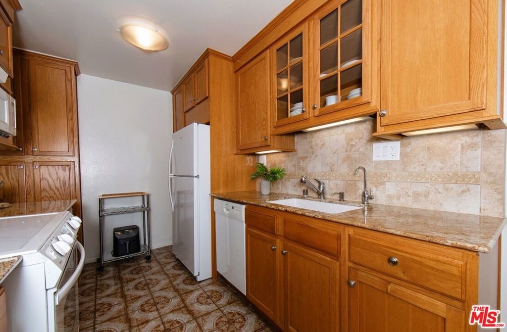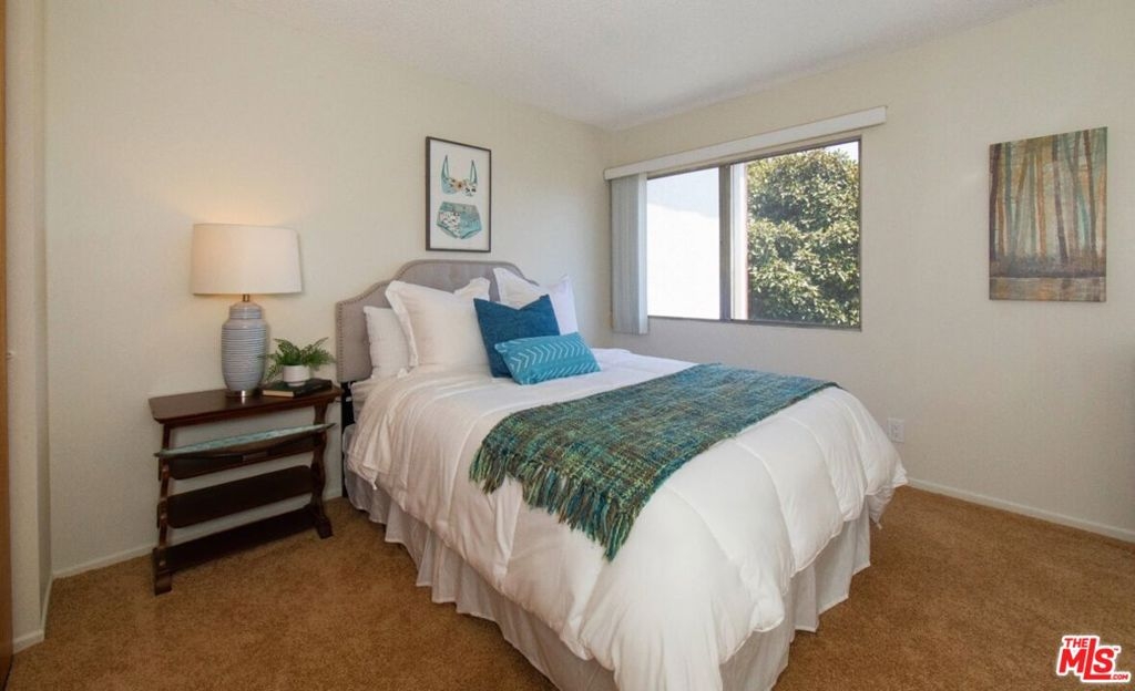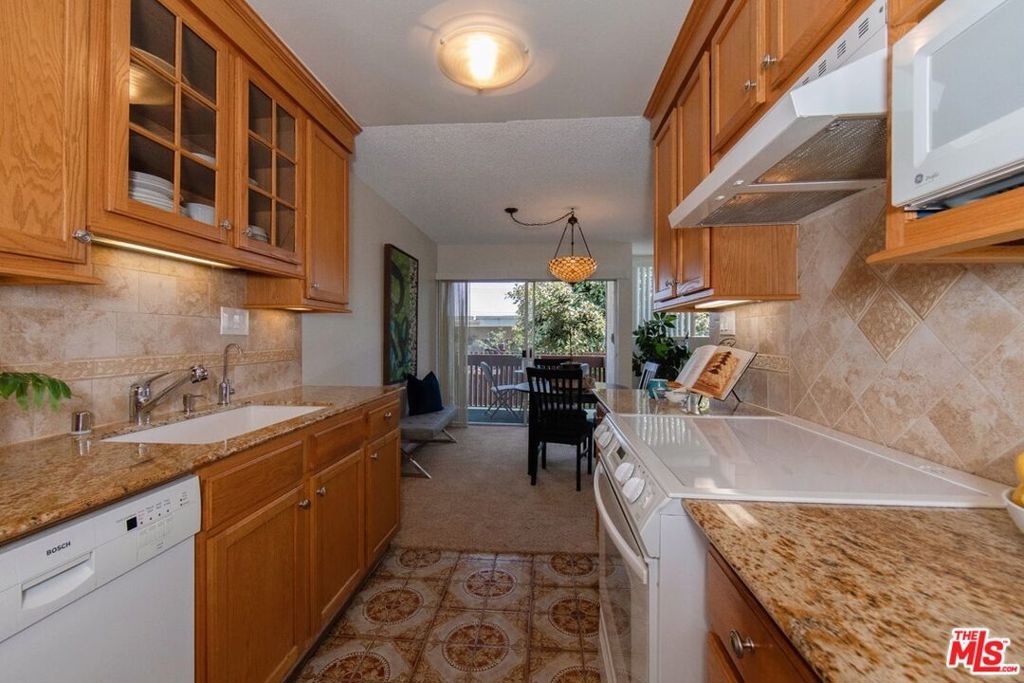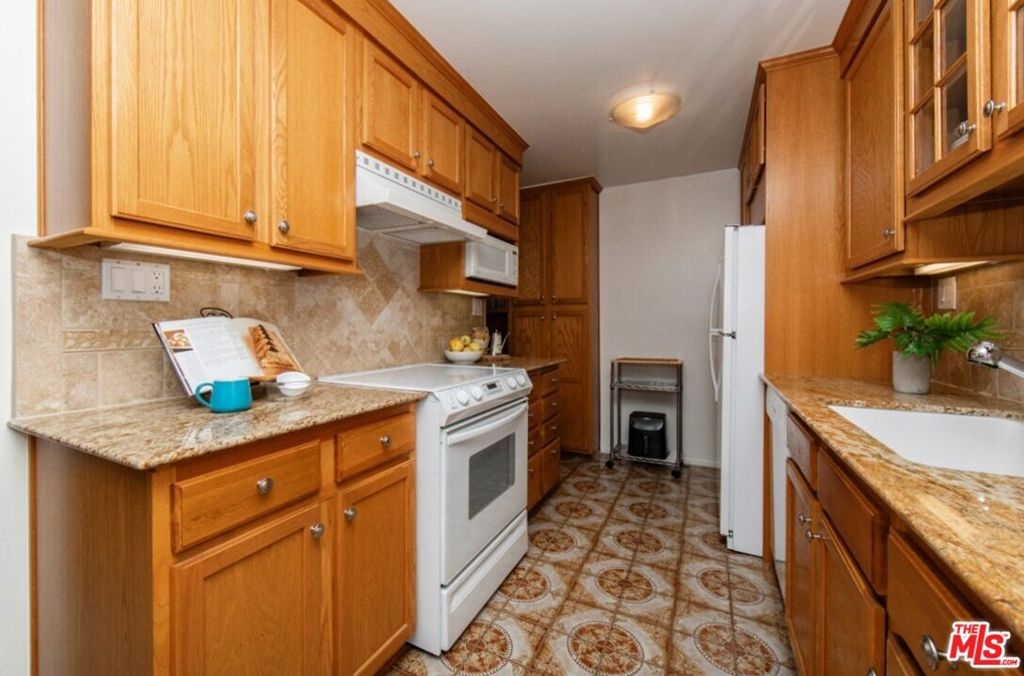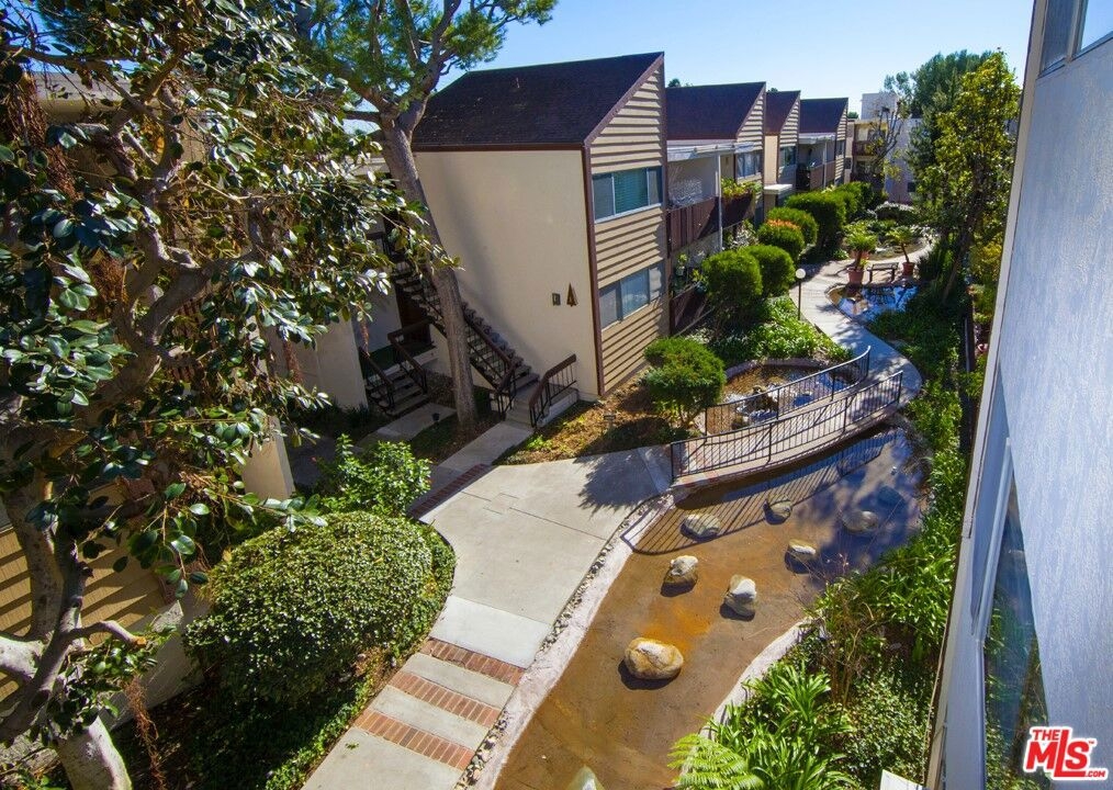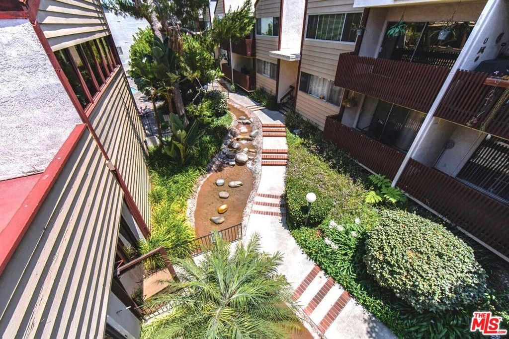 Highly sought-after top floor corner end unit with peaceful views of the lush interior grounds from every room and ideally positioned in the center of the complex near all the amenities including a large outdoor pool and sundeck, gym, sauna, clubhouse, and peaceful babbling brook below. Enter into an open and bright living room with a wall of windows that frame the outside trees and enjoy preparing meals in the remodeled kitchen with granite counters, wood cabinets with pullouts, oversized sink, slide-in oven, and tile flooring. The private primary suite offers a full bathroom and double-sided walk-in closet with custom shelving and pull-out storage drawers and the 2nd bedroom is roomy and comfortable with floor-to-ceiling closets. Additional highlights include a separate bar area with extra storage, ceiling fans, balcony overlooking a stream and fountain, and convenient location near the elevator and laundry room. Shopping mall, eateries, grocery stores, and parks are all nearby.